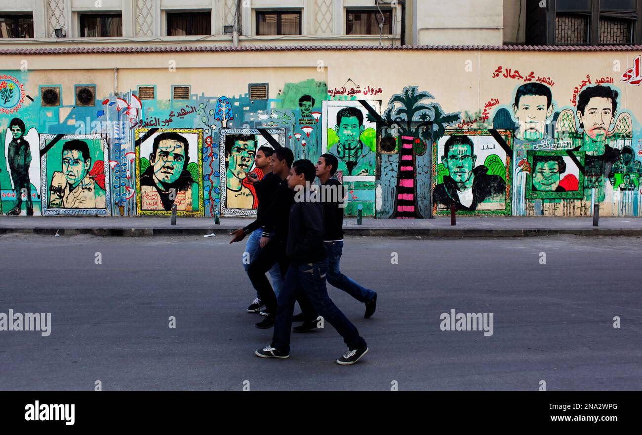 In this Thursday Feb 16 2012 photo Egyptian boys walk by a mural