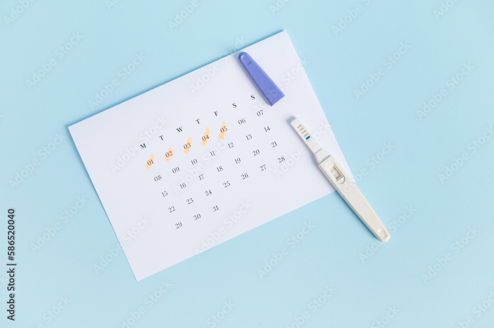 Top view of pregnancy test with two bars on white calendar with the