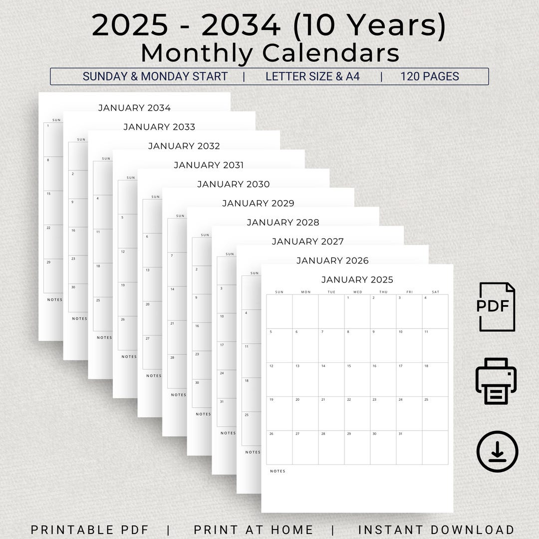 2025 2034 Calendar 10 Years Monthly Planner 2025 to 2034 Calendar