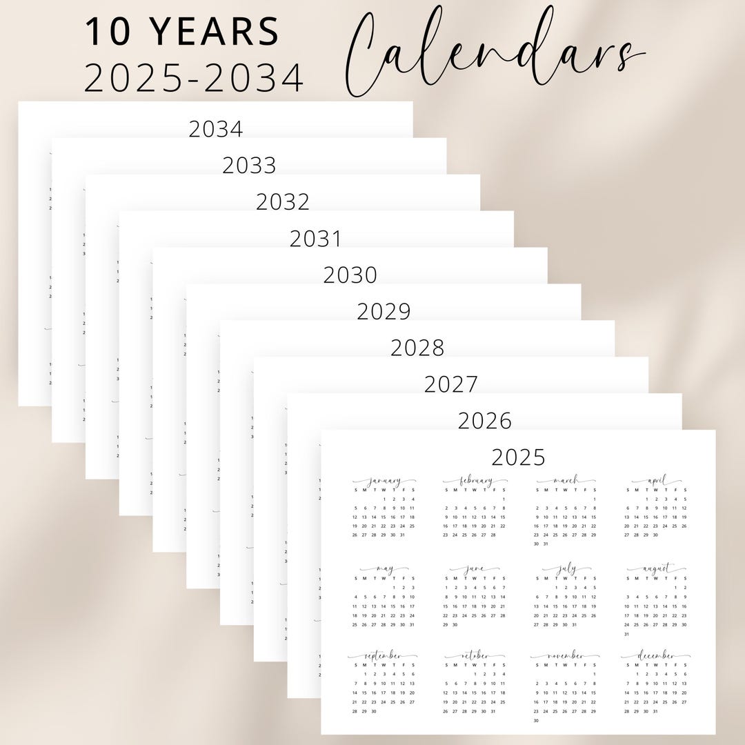 2025 2034 Yearly Calendar 10 Years Wall Calendar 2025 to 2034 Calendar
