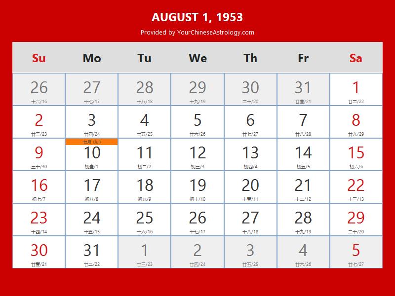 Chinese Calendar Aug 01 1953: Auspicious Things to Do and Hours Bazi