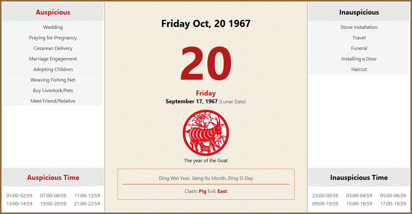 October 20 1967 Almanac Calendar: Auspicious/Inauspicious Events and