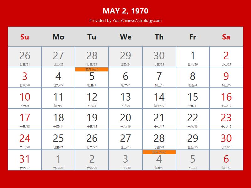 Chinese Calendar May 02 1970: Auspicious Things to Do and Hours Bazi