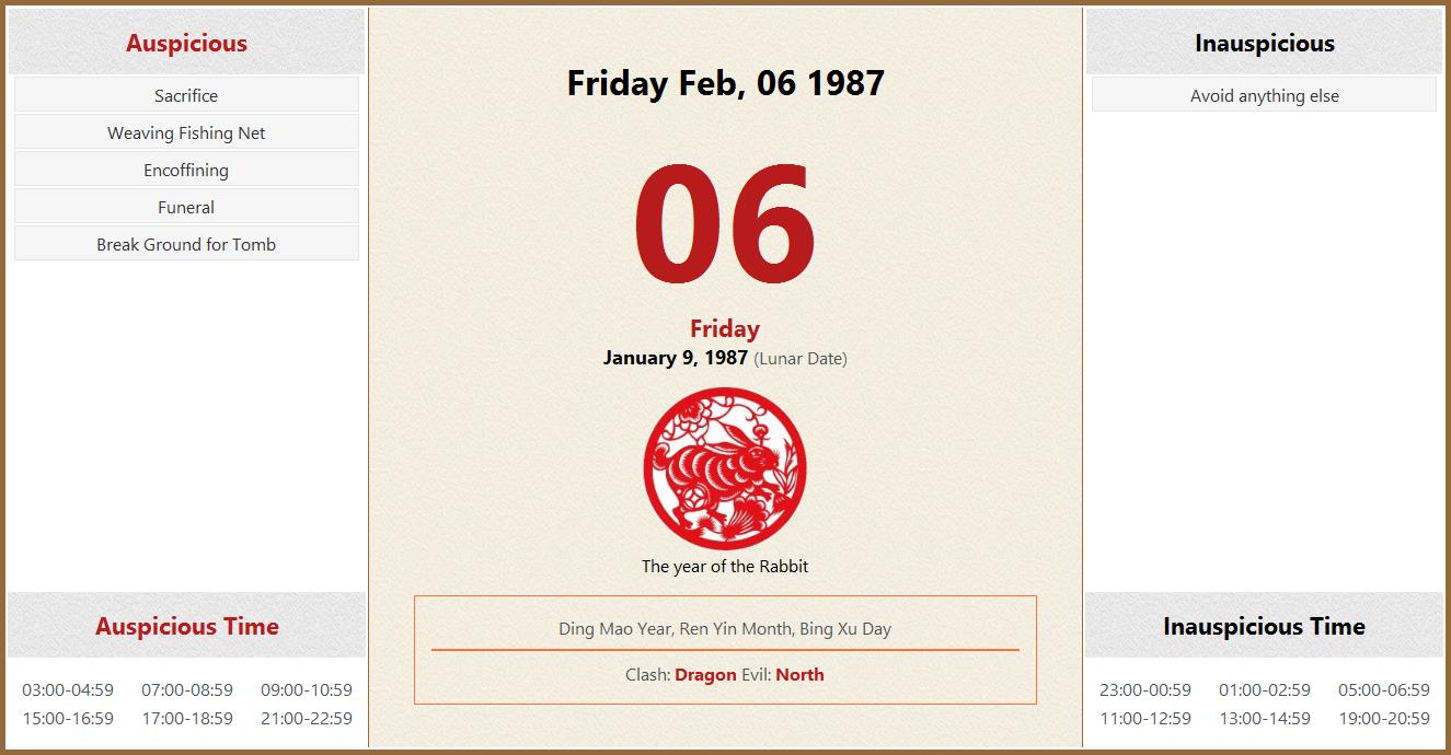February 06 1987 Almanac Calendar: Auspicious/Inauspicious Events and