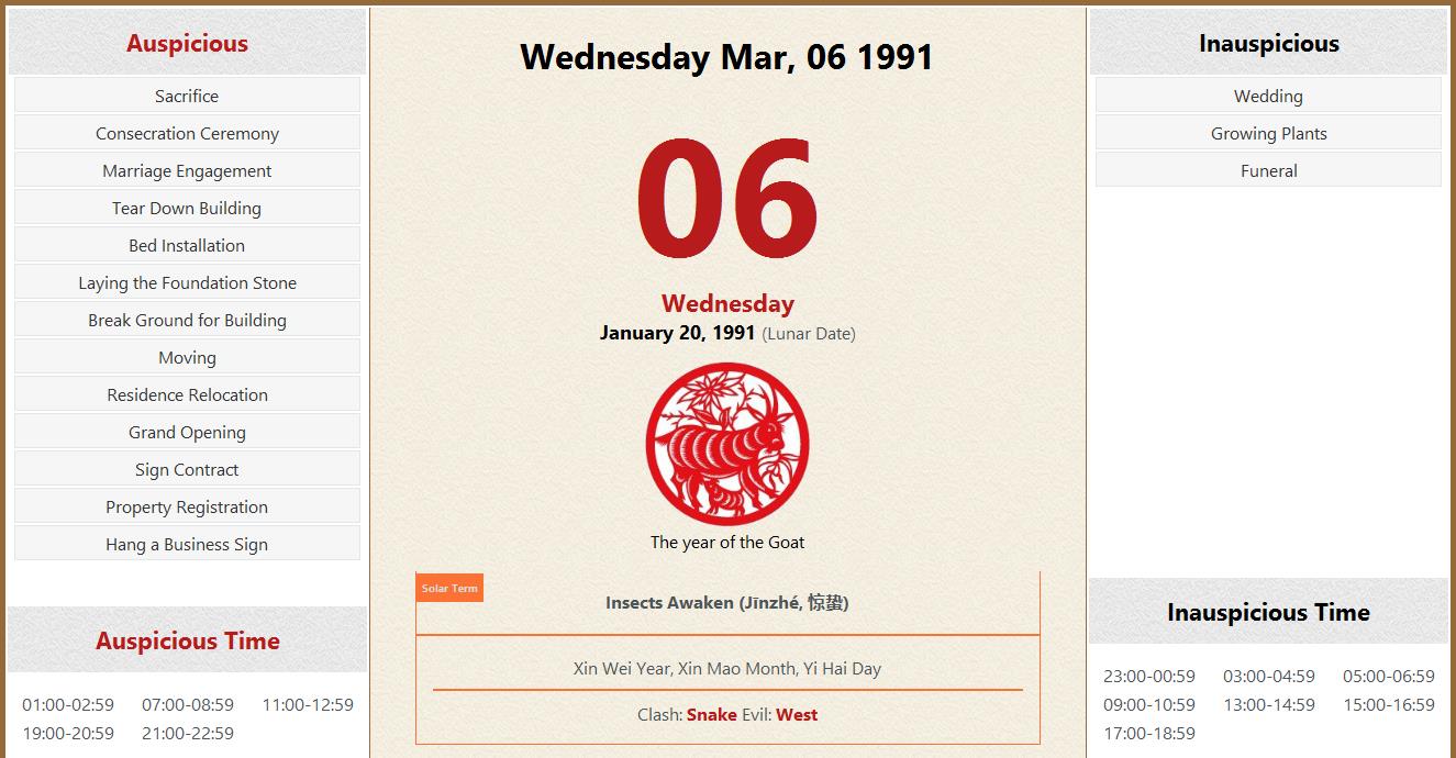March 06 1991 Almanac Calendar: Auspicious/Inauspicious Events and
