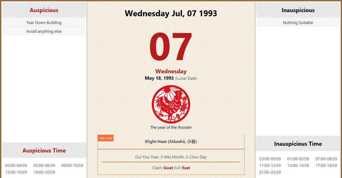 July 07 1993 Almanac Calendar: Auspicious/Inauspicious Events and Time
