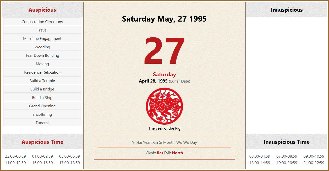 May 27 1995 Almanac Calendar: Auspicious/Inauspicious Events and Time