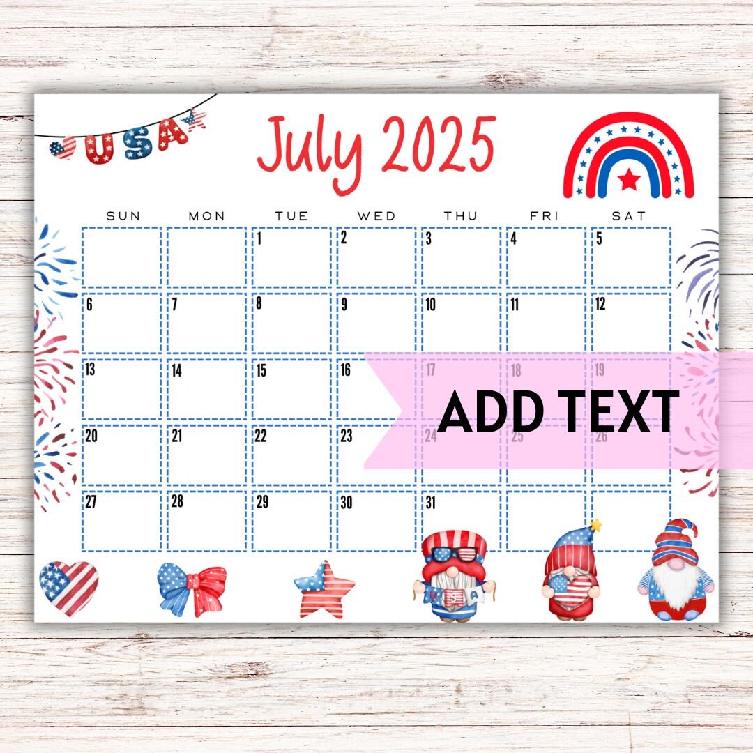 EDITABLE July 2025 Calendar 4th of July Calendar W/ Gnomes Monthly