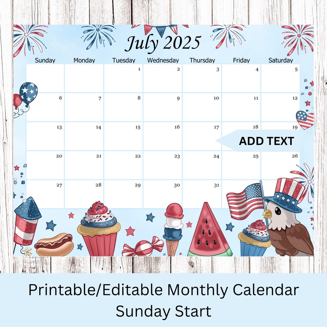 EDITABLE July 2025 Calendar 4th of July Independence Day Planner