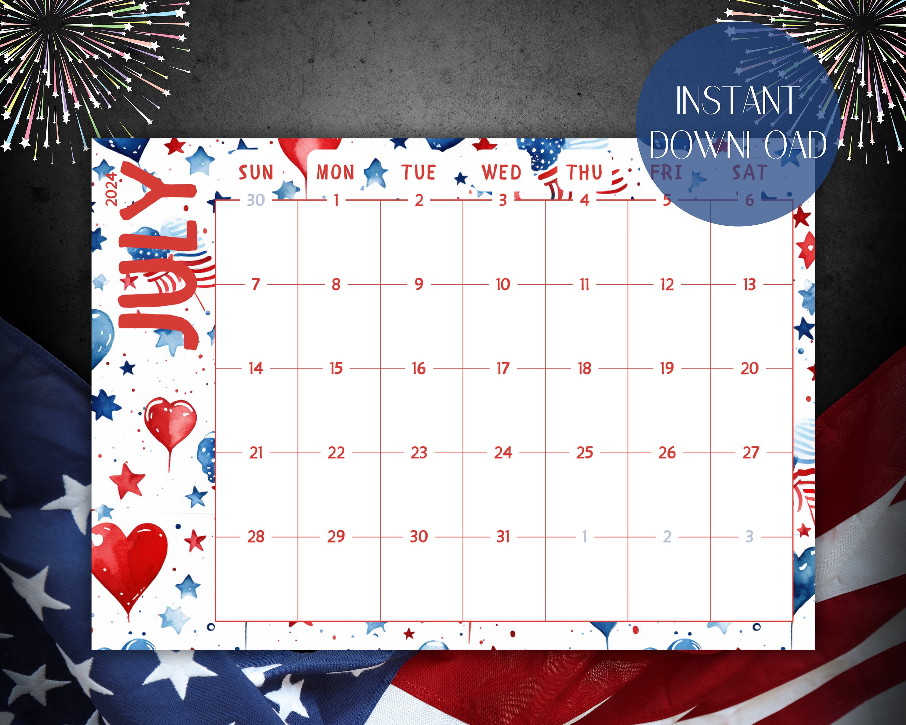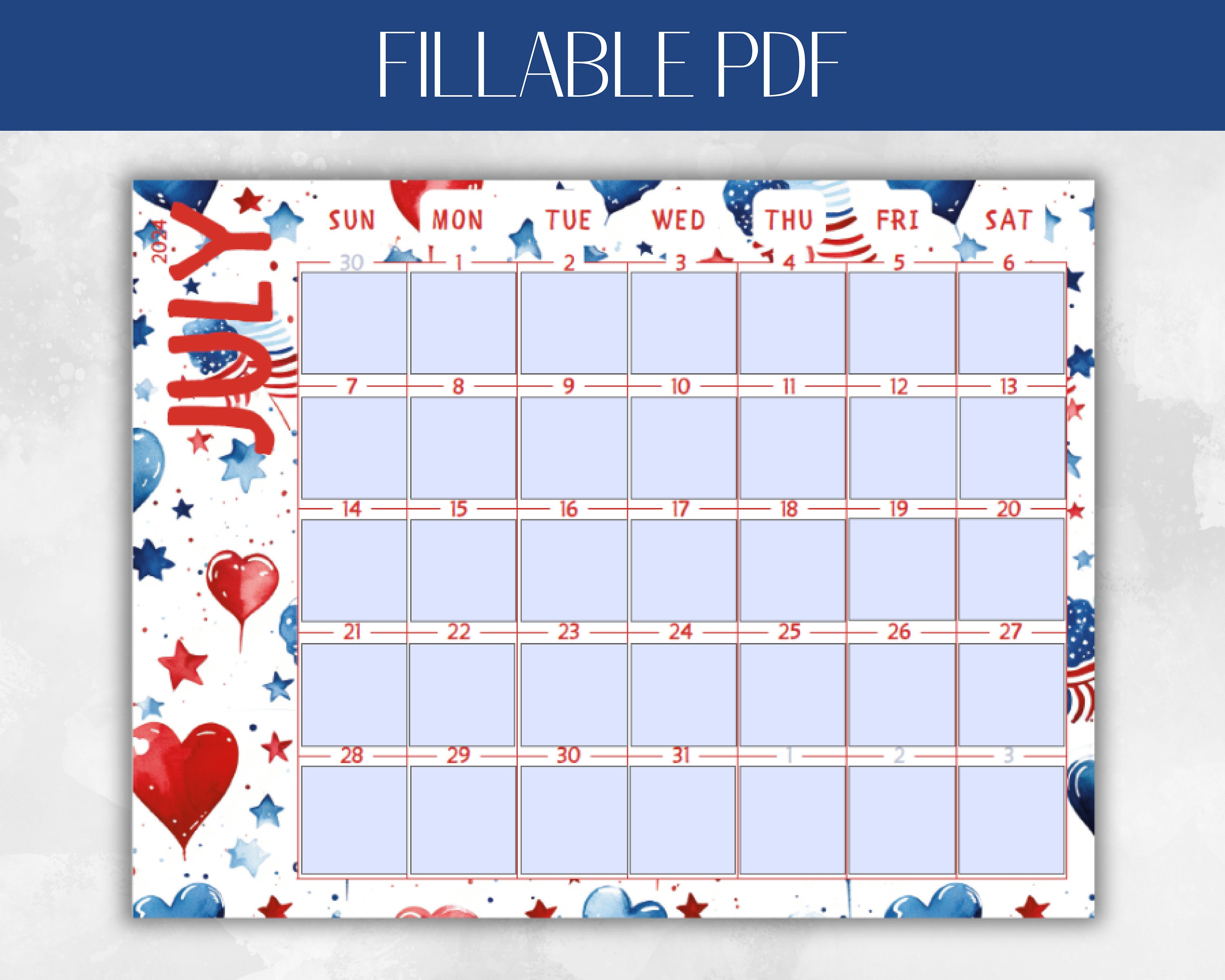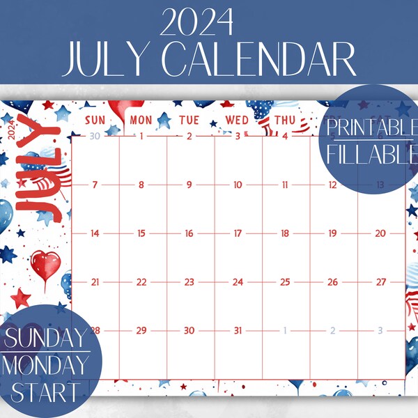 July 2024 Calendar Printable Fillable Fourth of July Calendar Summer