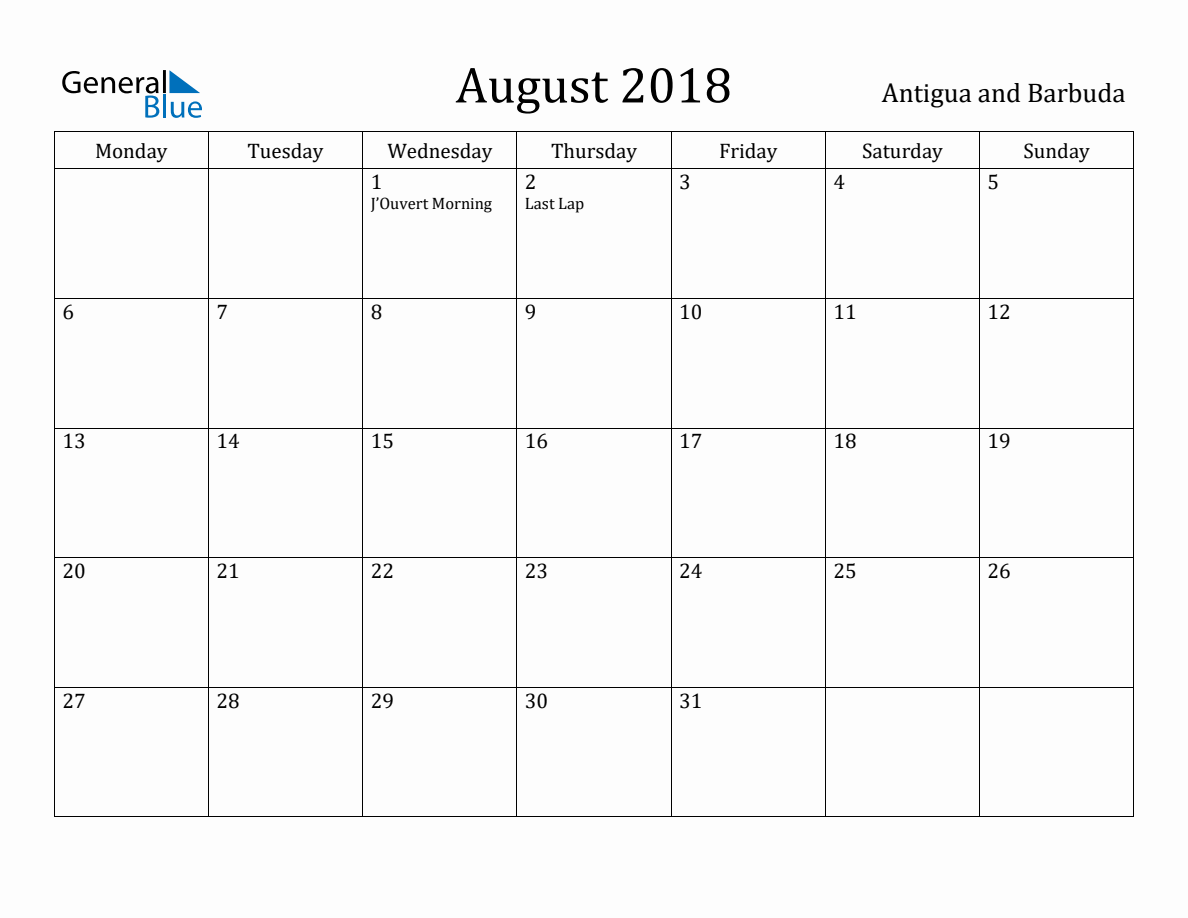 Antigua and Barbuda Monthly Calendar August 2018 (Monday Start)