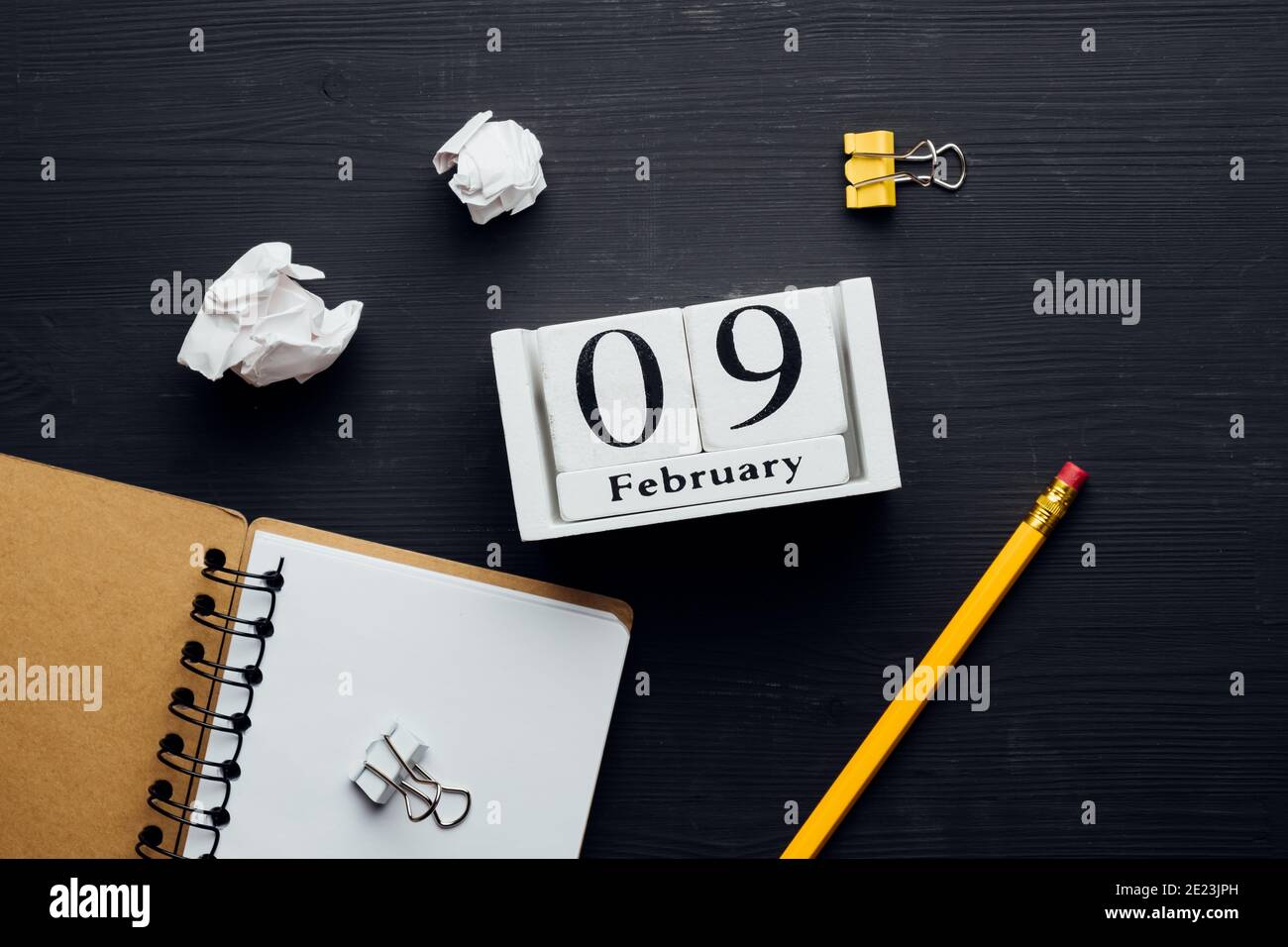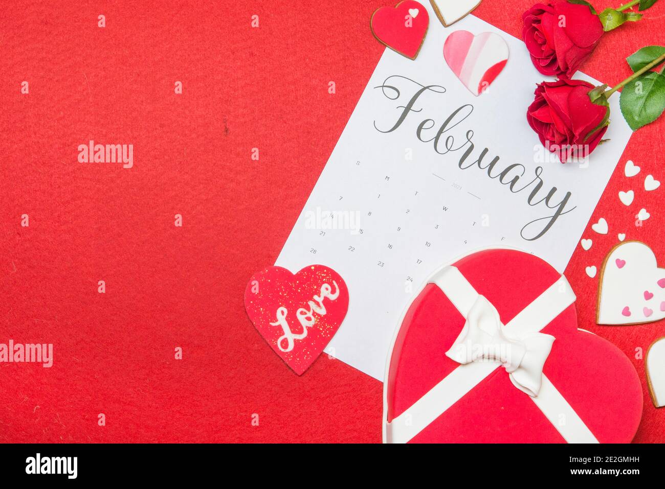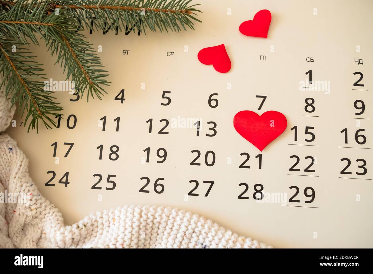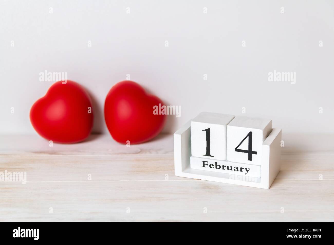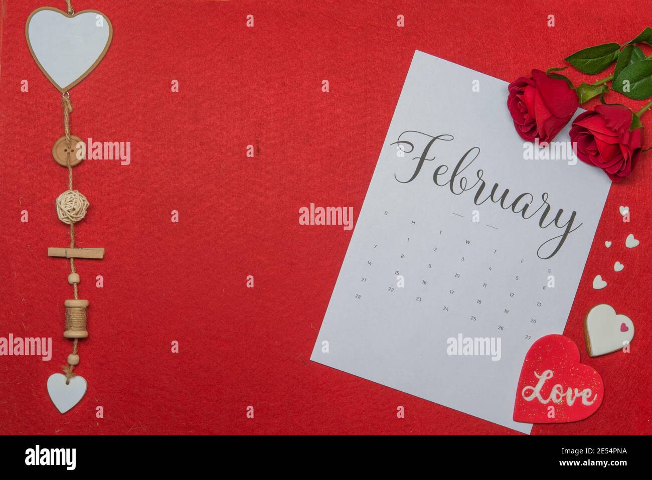 Sheet of wall calendar with red heart mark on 14 February Valentines
