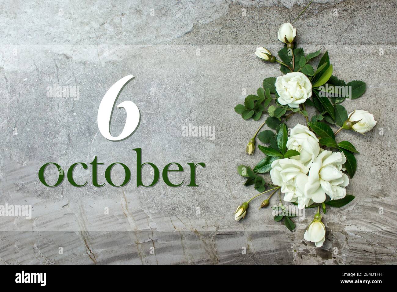 October 6th Day 6 of month Calendar date Stylish roses flat lay