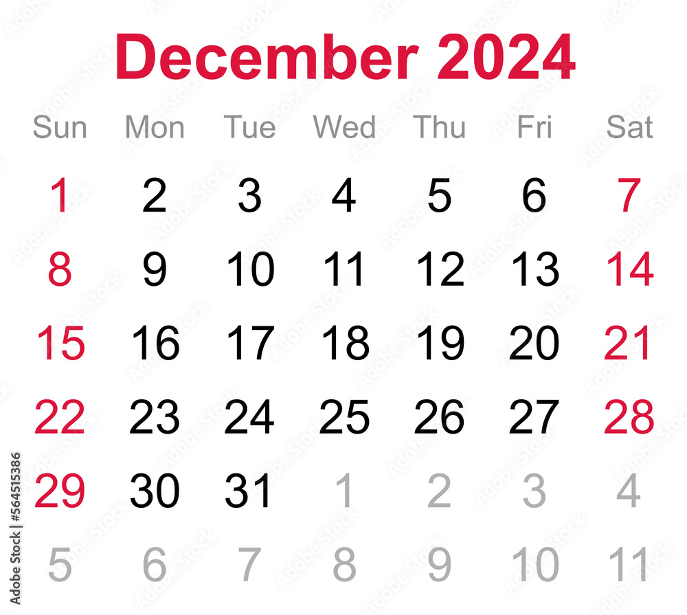 Monthly calendar of December 2024 on transparent background Stock