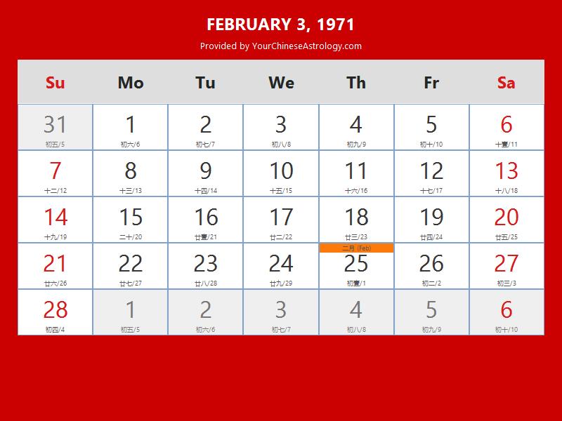 Chinese Calendar Feb 03 1971: Auspicious Things to Do and Hours Bazi