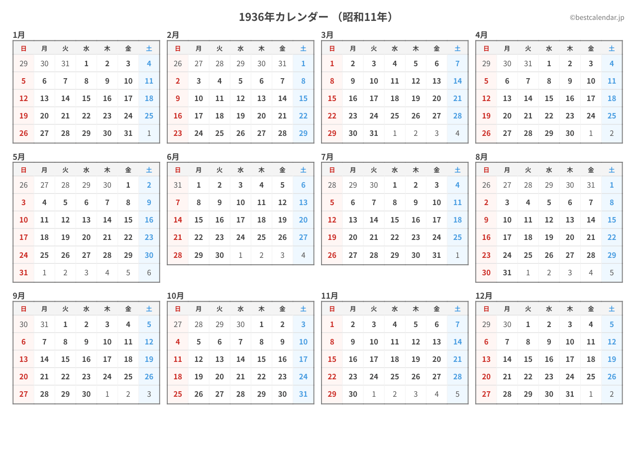1936年(昭和11年)のカレンダーをPDFと画像で無料ダウンロード ベストカレンダー