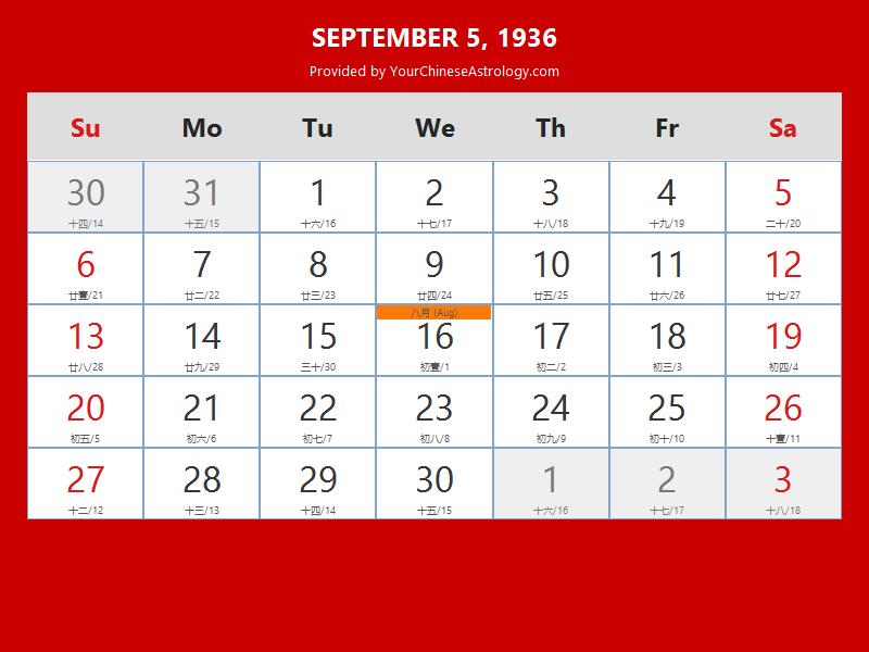 Chinese Calendar Sep 05 1936: Auspicious Things to Do and Hours Bazi