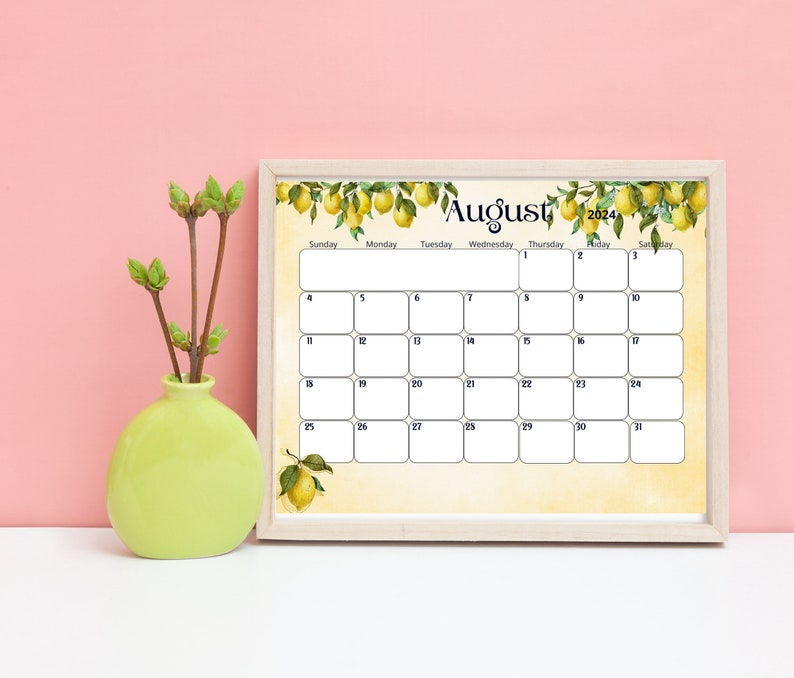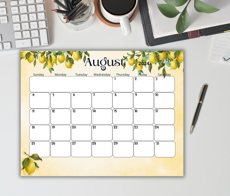 Editable August 2024 Calendar lemon Printable Planner Digital Monthly