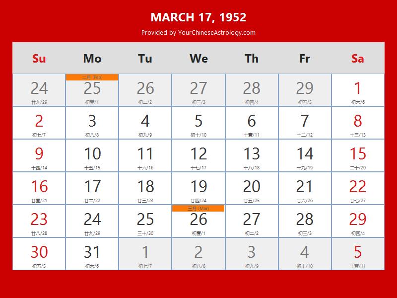 Chinese Calendar Mar 17 1952: Auspicious Things to Do and Hours Bazi