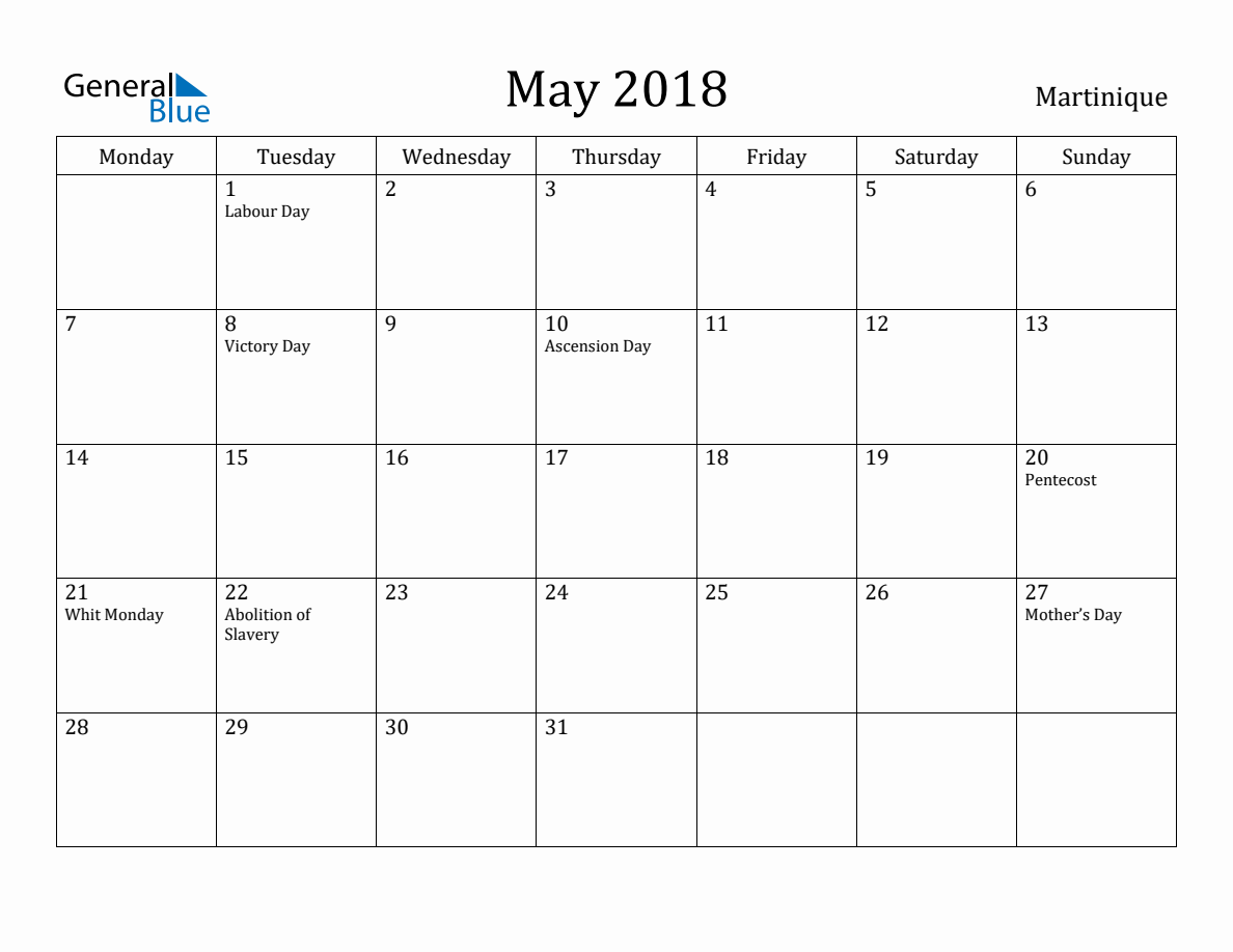 Martinique Monthly Calendar May 2018 (Monday Start)