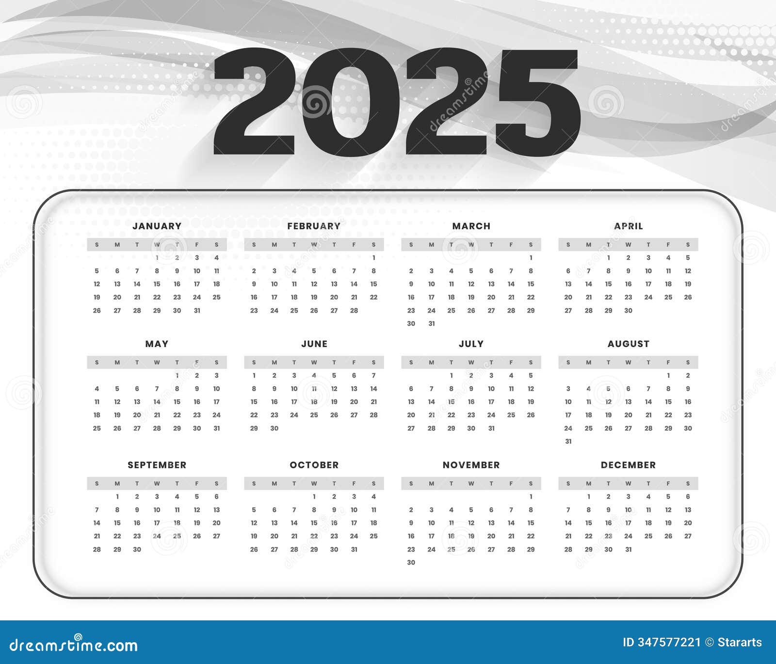 Calendar 2025 Printable Calendar for 2025 Sunday Start Stock