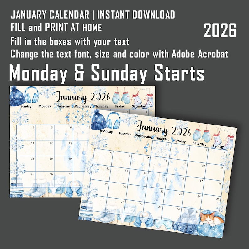 Editable January 2026 Calendar Cute Winter 2026 PDF Calendar Printable