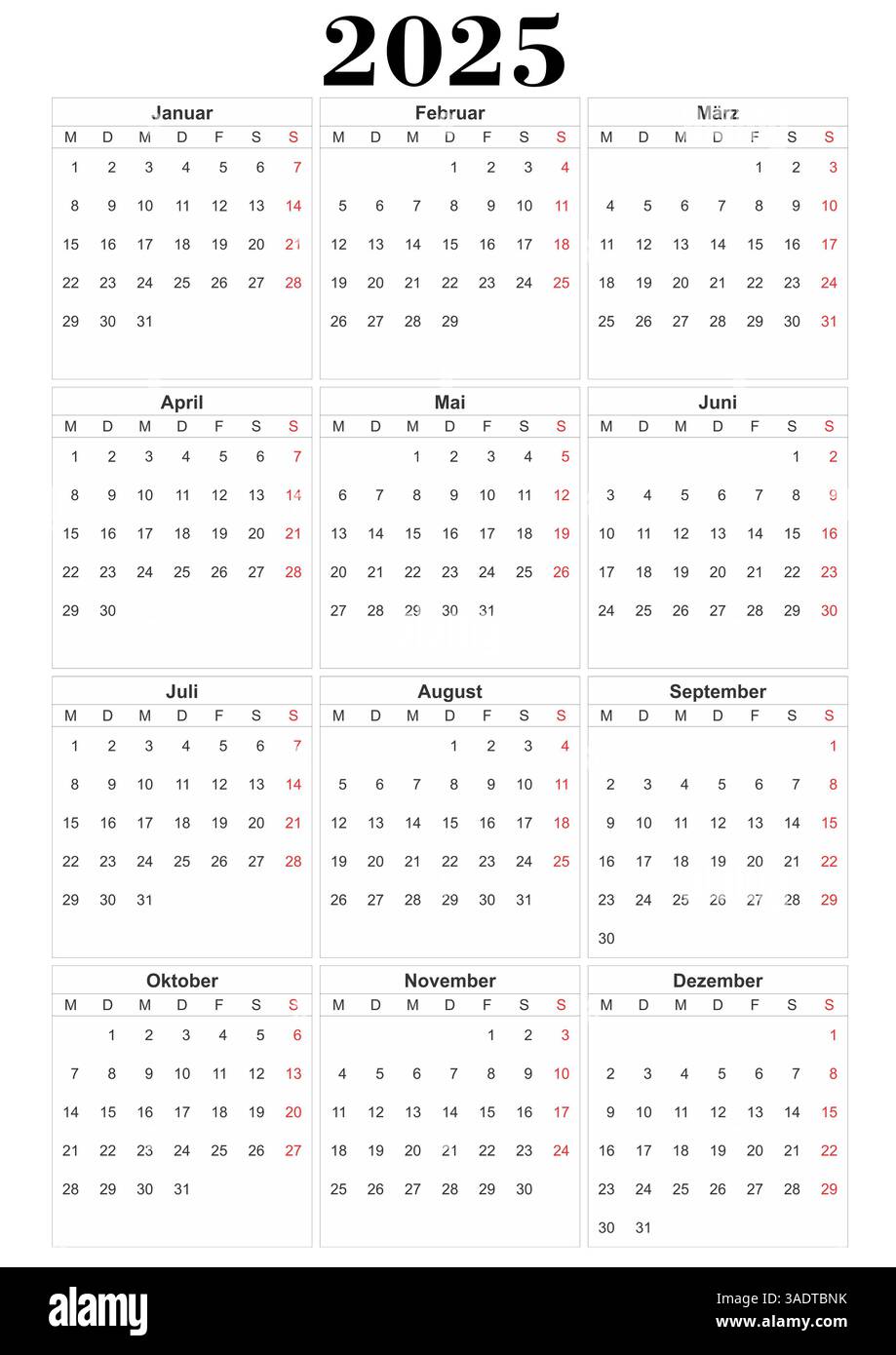 2025 year german calendar Printable vector illustration for Germany in