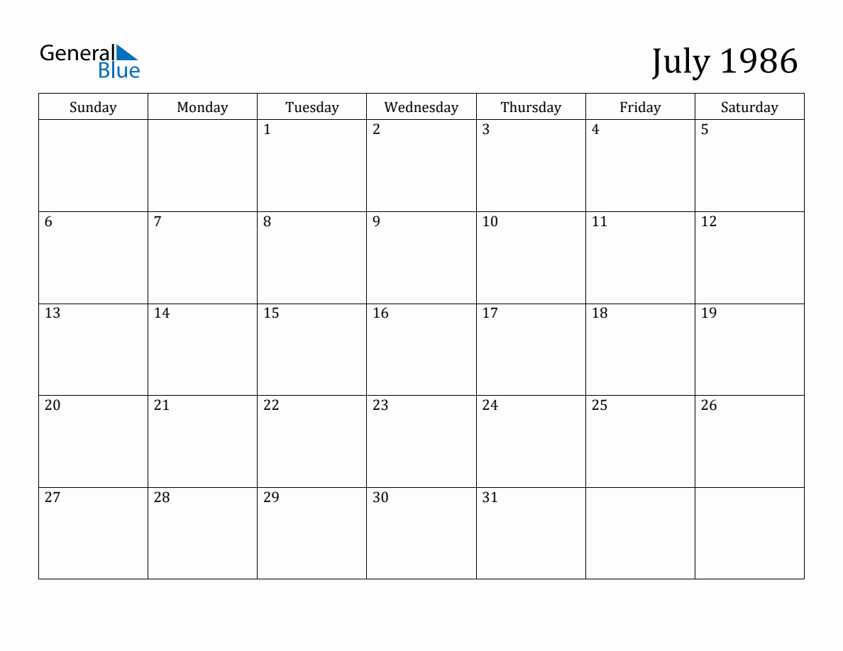 July 1986 Monthly Calendar