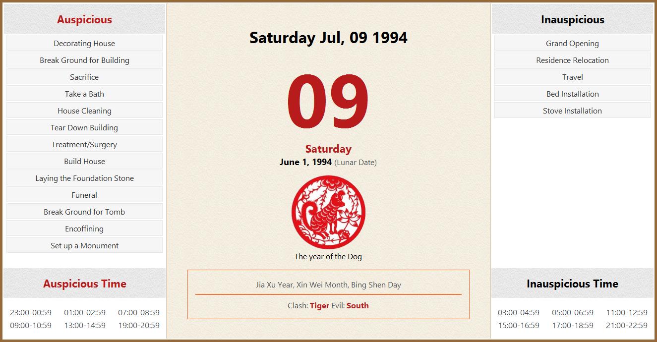 July 09 1994 Almanac Calendar: Auspicious/Inauspicious Events and Time
