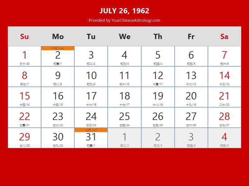 Chinese Calendar Jul 26 1962: Auspicious Things to Do and Hours Bazi