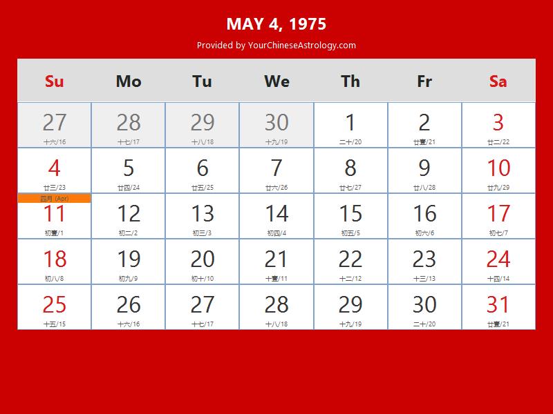 Chinese Calendar May 04 1975: Auspicious Things to Do and Hours Bazi