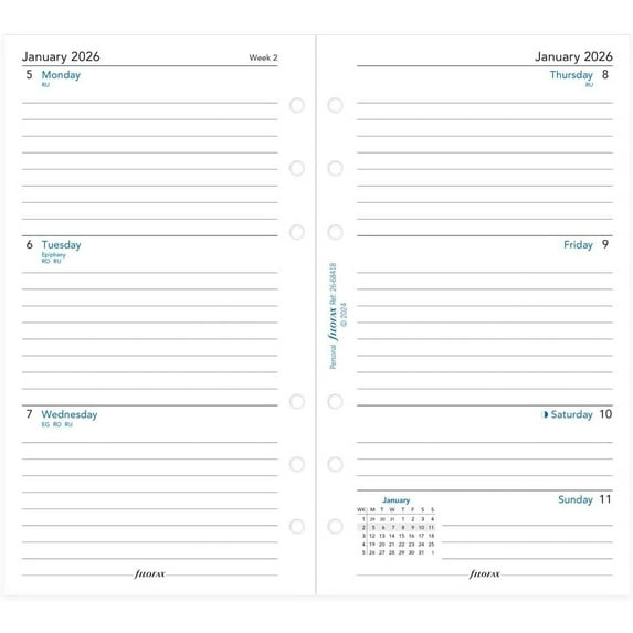 Calendar Diary Refill Personal/Compact Size Week to View White Paper