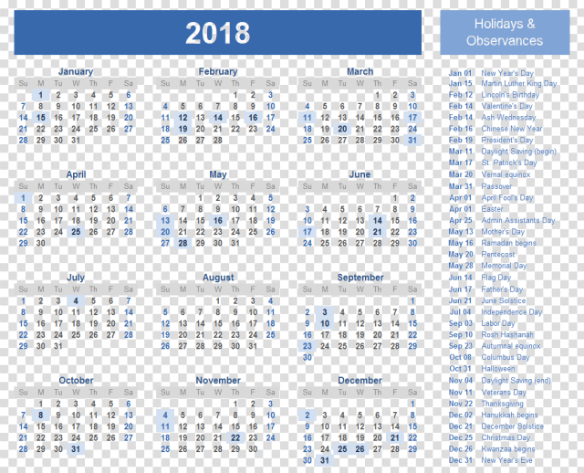 Calendar 2018 Holidays PNG
