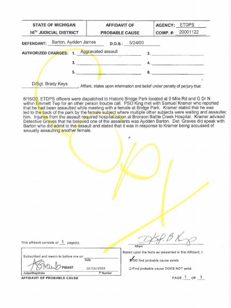 Affidavit of Probable Cause Calhoun County District Court PDF