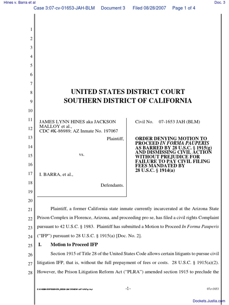 Hines v Barra Et Al Document No 3 PDF Federal Rules Of Civil