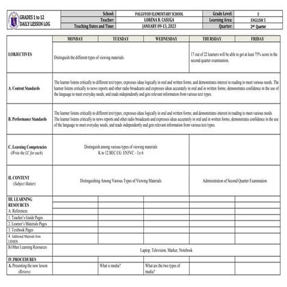 DLL 1a1 daily lesson log GRADE 1 to 12 DAILY LESSON LOG School