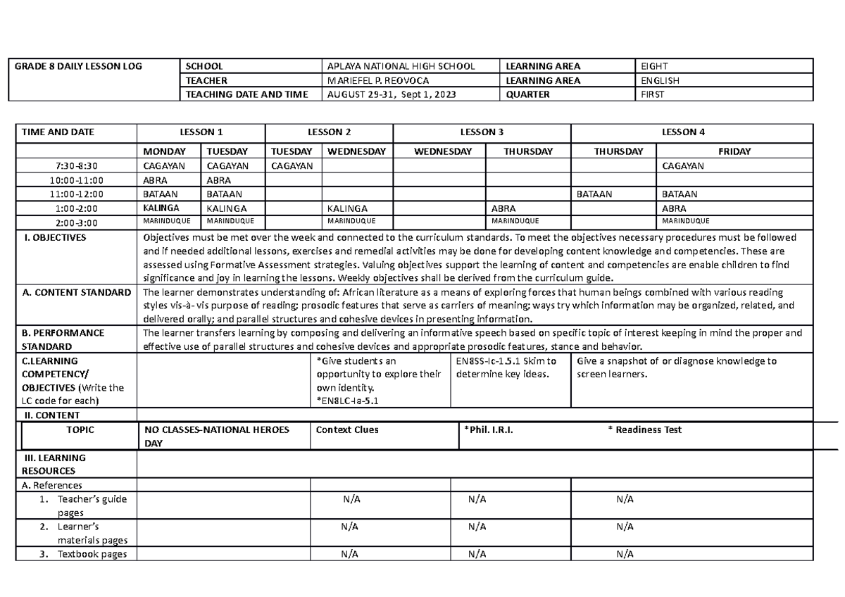 MPR DLL Q1 W1 Aug 29 31 Sept 1 2023 GRADE 8 DAILY LESSON LOG SCHOOL