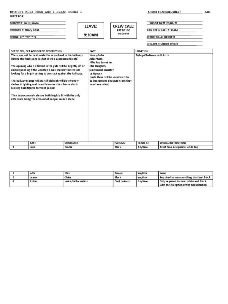 Leave: Crew Call:: Short Film Call Sheet PDF