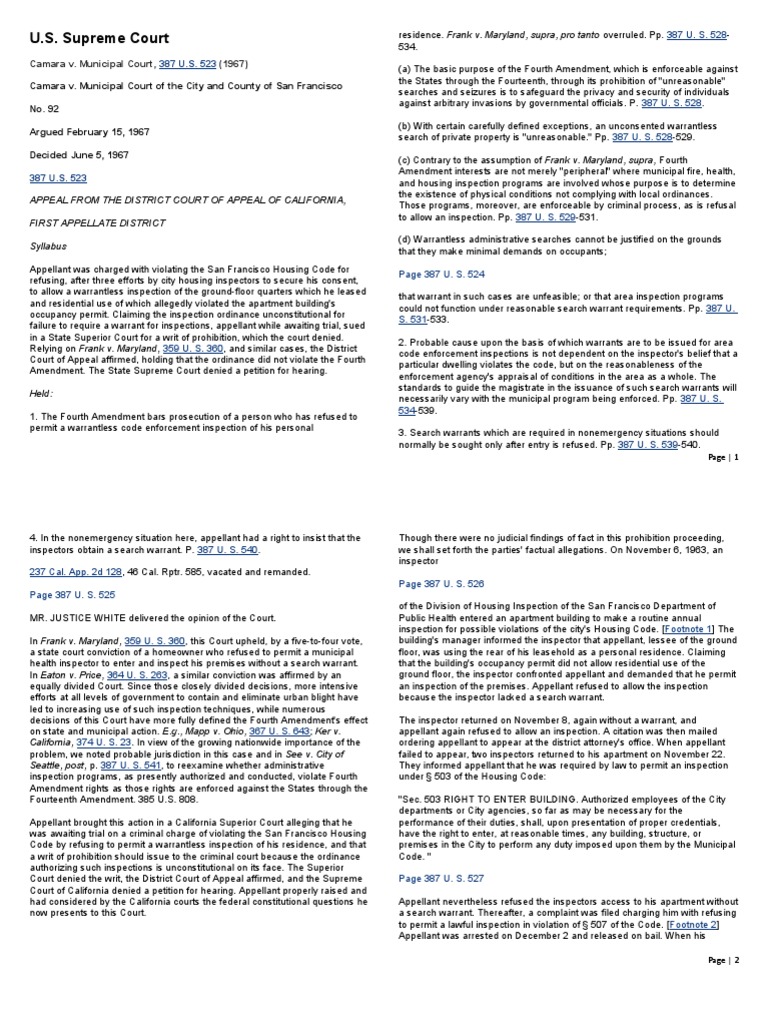 Camara v Municipal Court of the City and County of San Francisco Case
