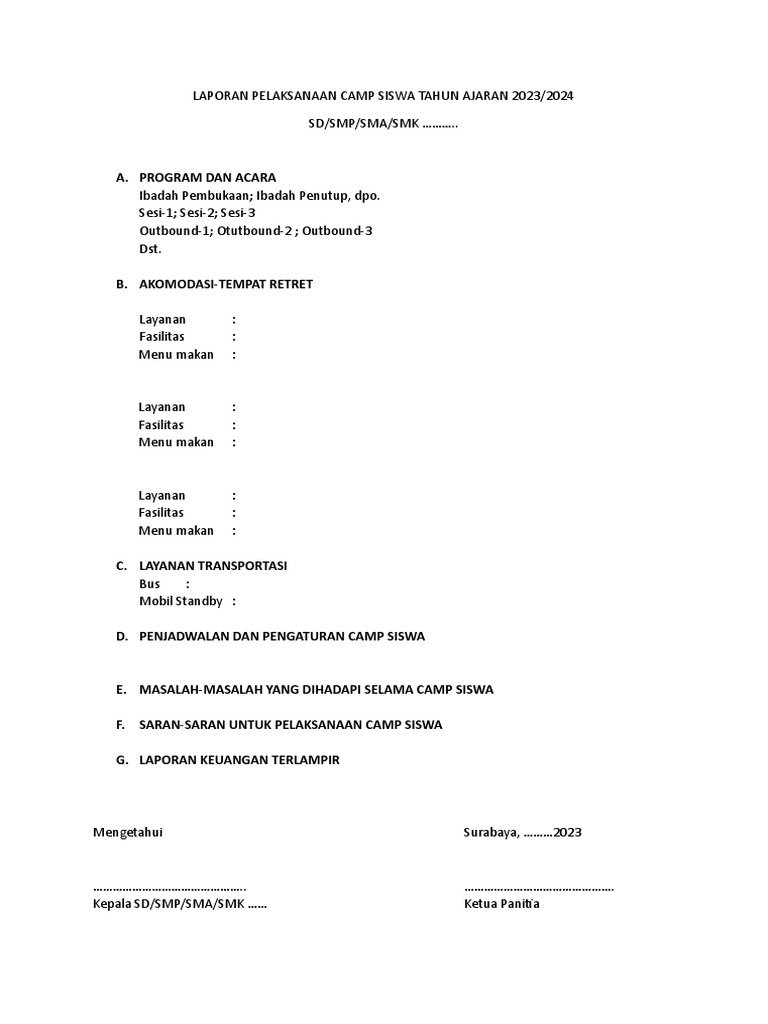 Contoh Laporan Pelaksanaan Camp Siswa PDF
