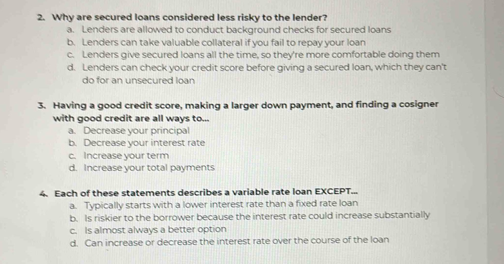 Solved: Why are secured loans considered less risky to the lender? a