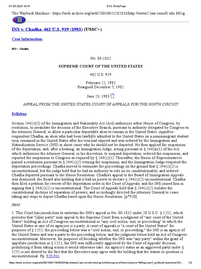 INS v Chadha: Supreme Court Rules One House Congressional Veto