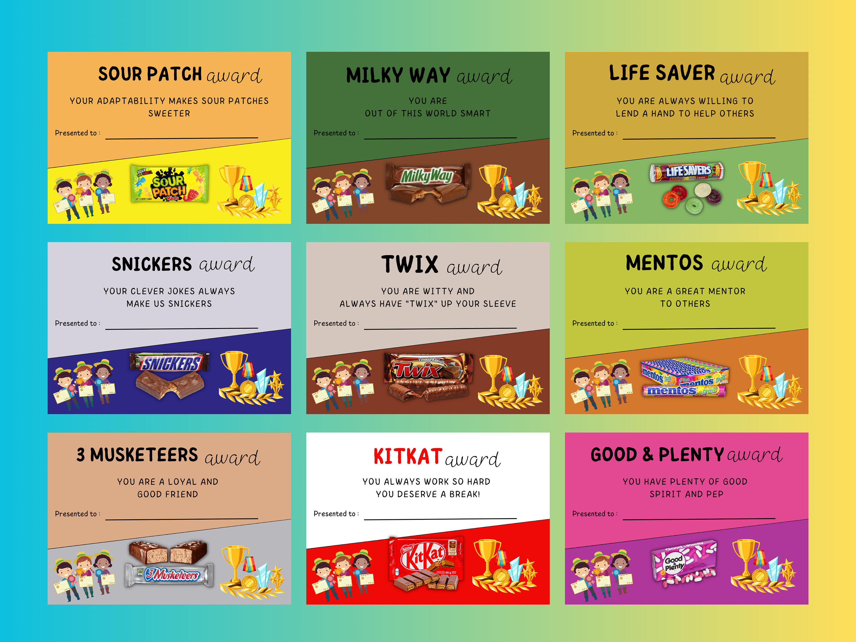 Candy Bar Award Certificates are a fun and thoughtful award to use for