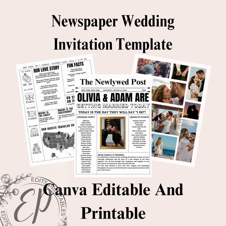 Wedding Invitation Canva Newspaper Template Printable Editable