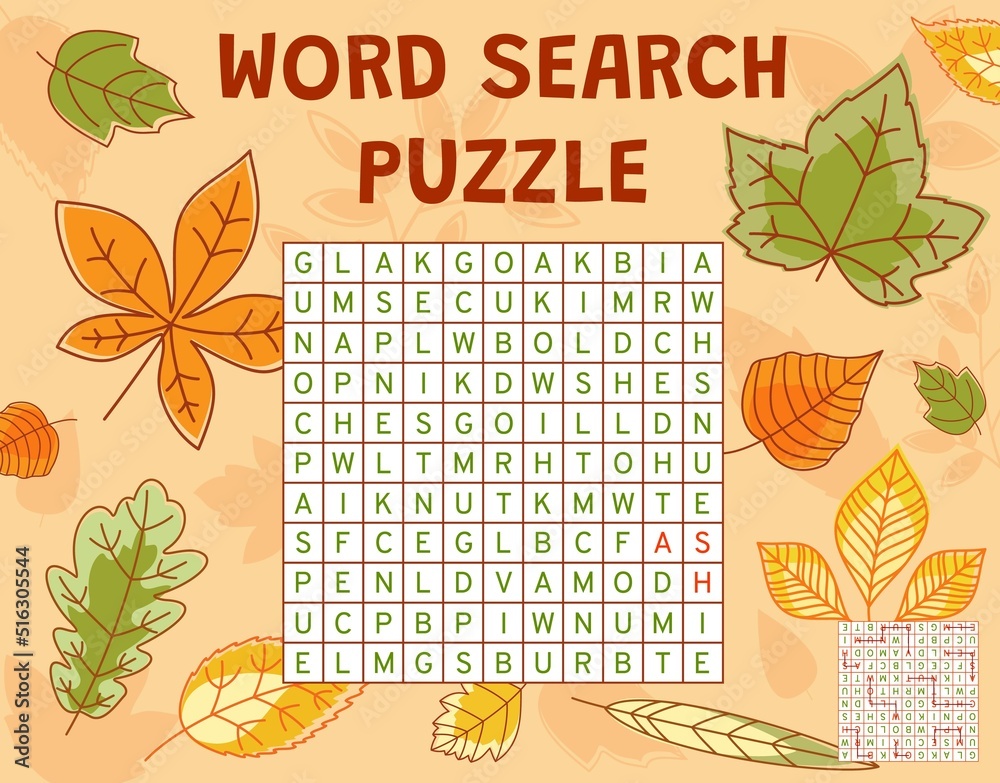 Autumn tree leaves word search puzzle game worksheet quiz grid Vector