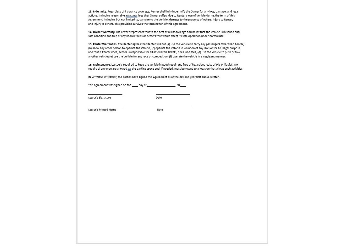 Car Rental Agreement Template Etsy
