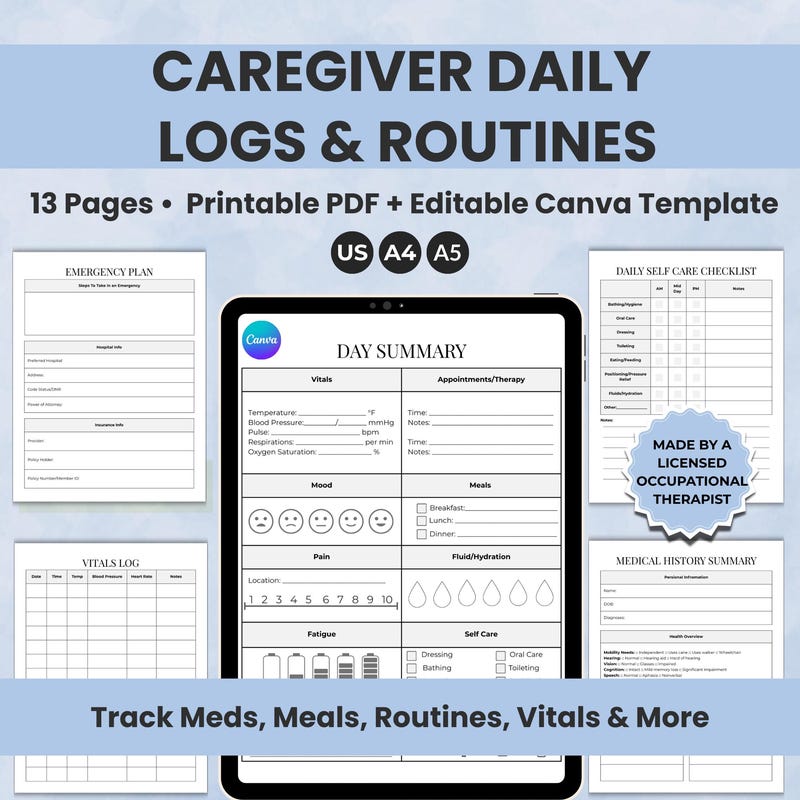 Caregiver Planner: Medical Binder Daily Task Log (PDF Printable
