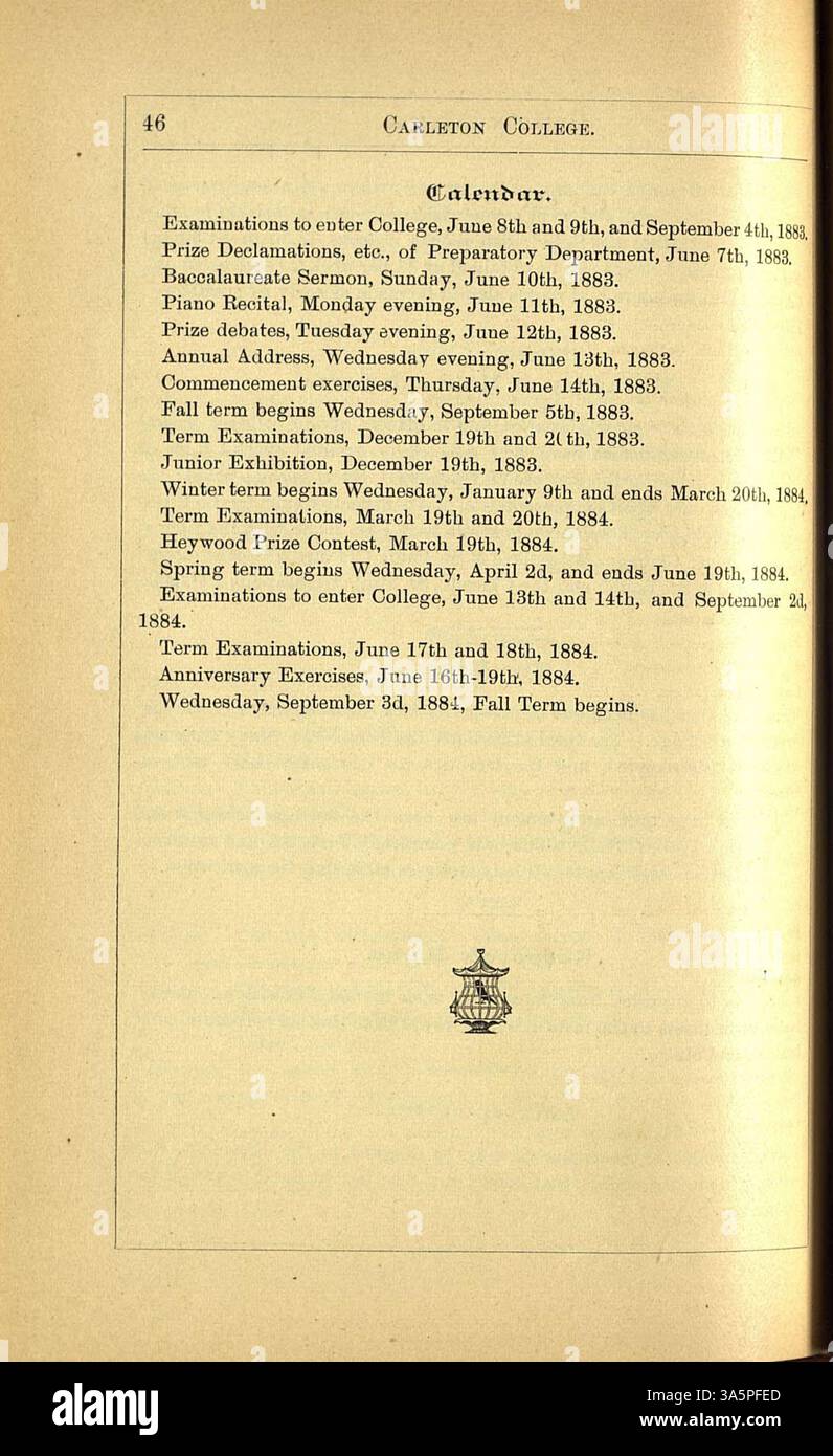 Carleton College #39 s 1884 1885 academic catalog features a range of