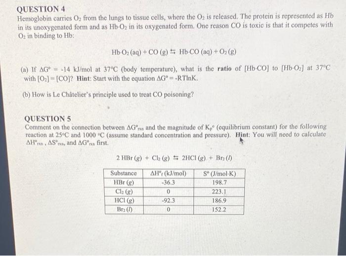 Solved QUESTION 4 Hemoglobin carries O2 from the lungs to Chegg com