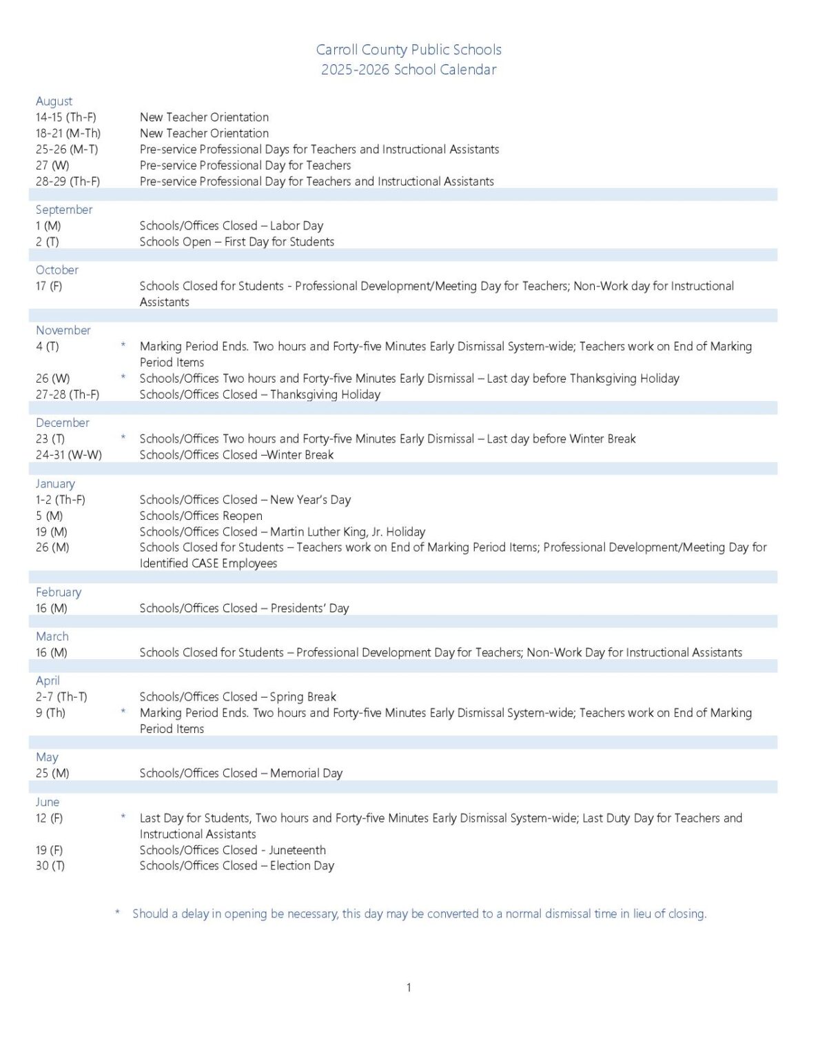 Carroll County Public Schools Calendar 2025 2026 in PDF School